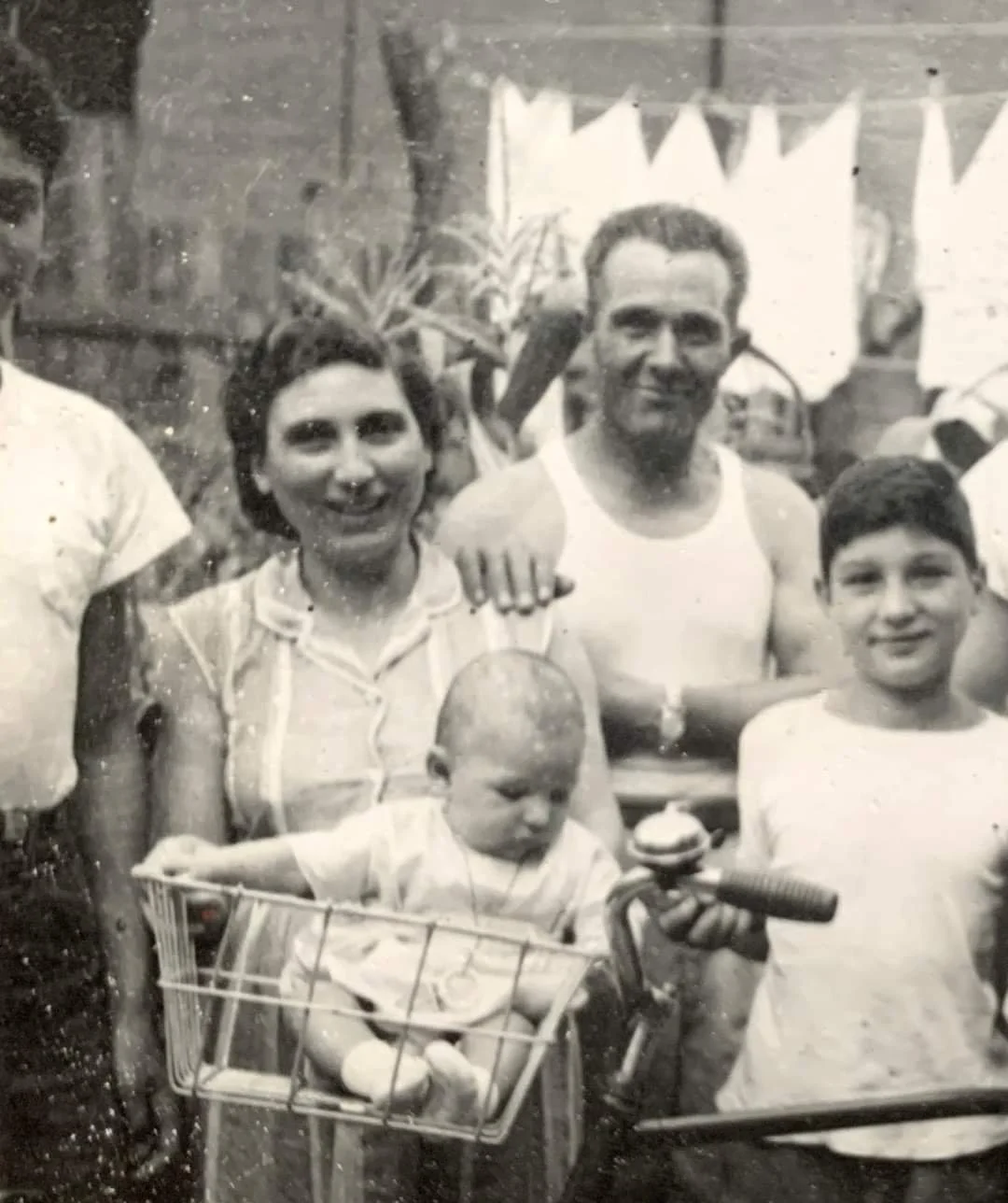 The Luciani family, circa 1965, Toronto, Ontario, Canada. Elia, Giovanni, Terenzio (Terry) and baby Tony (dad) in the bike basket.